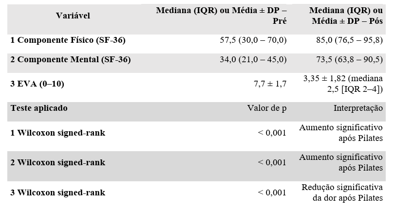 Legenda: Valores de mediana (ou média ± desvio-padrão) dos componentes físico e mental do SF-36 e da Escala Visual Analógica (EVA) antes e após a intervenção com Pilates. Observa-se aumento significativo dos escores físico e mental e redução significativa da dor após a prática. Teste estatístico: Wilcoxon signed-rank; nível de significância p < 0,001.