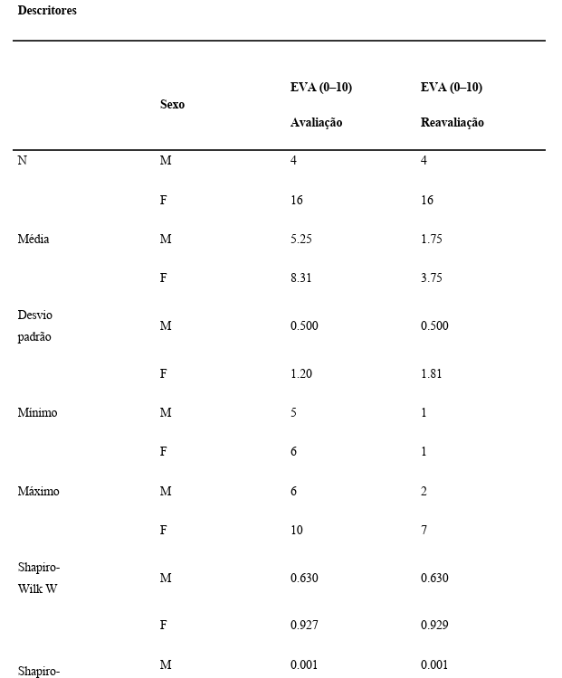 Os valores mínimos e máximos também confirmam a tendência de melhora. No grupo masculino, a EVA variou de 5 a 6 no momento inicial de 1 a 2 após a intervenção. Entre as mulheres, os valores oscilaram de 6 a 10 na avaliação e de 1 a 7 na reavaliação, mostrando redução expressiva da dor em praticamente todas as participantes. Quanto à análise de normalidade pelo teste de Shapiro-Wilk, observou-se que os valores de p para o grupo masculino (p = 0,001) indicam distribuição não normal. Já para o grupo feminino, os valores de p foram superiores a 0,05 (p = 0,218 e p = 0,235), demonstrando distribuição normal dos dados.