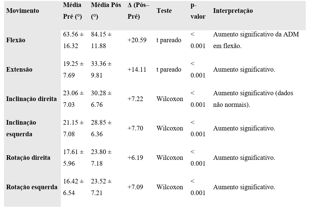 Legenda: Valores médios (± desvio padrão) da amplitude de movimento (ADM) lombar, em graus (°), antes e após a intervenção fisioterapêutica. Observa-se aumento significativo em todas as direções analisadas (p < 0,001),  indicando melhora da mobilidade cervical global. A flexão apresentou o maior ganho médio (+20,59°), seguida  pela extensão (+14,11°) e pelos movimentos de inclinação e rotação, com variações entre +6° e +7°. O teste t pareado foi aplicado para variáveis com distribuição normal, enquanto o teste de Wilcoxon foi utilizado para  dados não normais.