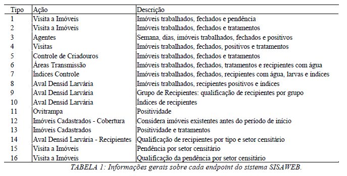 O SISAWEB é um sistema que contém uma estrutura de requisição dividida em 16 endpoints  (endereços web) determinados tipos. Cada endpoint possui um tema retratado dentro das  informações disseminadas sobre o vetor. Para facilitar a compreensão, foi criada a tabela a seguir  contendo todos os 16 endpoints em ordem: