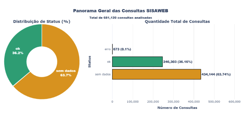 Das 681.120 consultas realizadas ao SISAWEB, apenas 246.303 (36,16%) retornaram dados com  sucesso, enquanto 434.144 (63,74%) apresentaram ausência de dados e 673 (0,10%) resultaram  em erros técnicos. Esses números revelam que a maioria das consultas não retornam dados,  indicando tanto lacunas na cobertura do sistema quanto possíveis deficiências na alimentação de  dados pelos municípios.