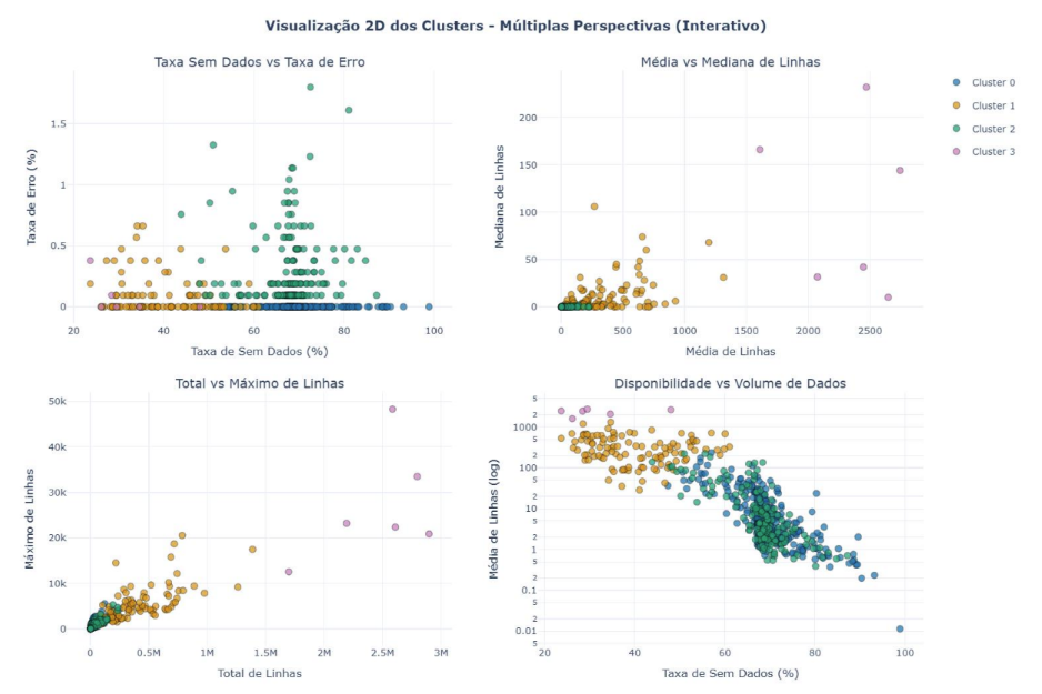 FIGURA 3: Visualização 2D dos Clusters – 4 subplots mostrando diferentes perspectivas dos clusters (Taxa Sem  Dados vs Taxa de Erro; Média vs Mediana de Linhas; Total vs Máximo de Linhas; Disponibilidade vs Volume)
