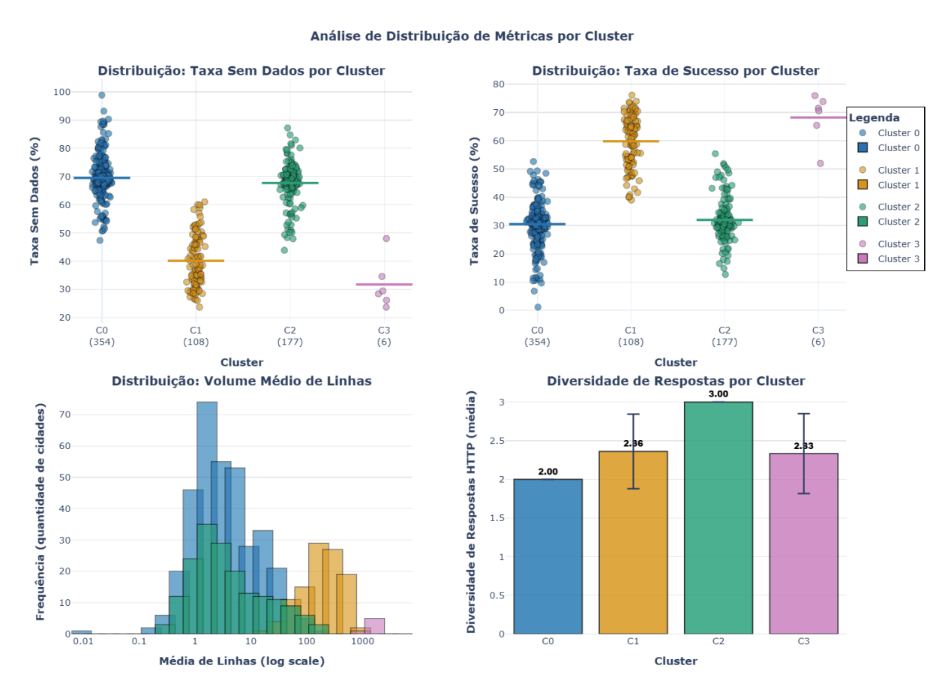 FIGURA 4: Análise de Distribuição de Métricas por Cluster – 4 painéis: (1) Strip plot de Taxa Sem Dados, (2) Strip  plot de Taxa de Sucesso, (3) Histograma de Média de Linhas em escala log, (4) Barras de Diversidade de Respostas