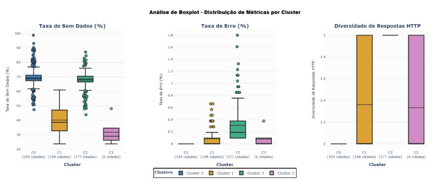 Cluster 2 (177 municípios – 27,4%): “Baixa Disponibilidade – Volume Baixo com Erros”. Este  grupo apresenta baixa taxa de sucesso (31,99%), alta taxa de sem dados (67,71%) e a maior taxa  de erros entre todos os clusters (0,31%). Com média de apenas 19,31 linhas e total acumulado de 3.608.520 linhas, esses municípios enfrentam tanto problemas técnicos quanto baixo volume de  dados, sugerindo infraestrutura problemática ou dados inconsistentes.