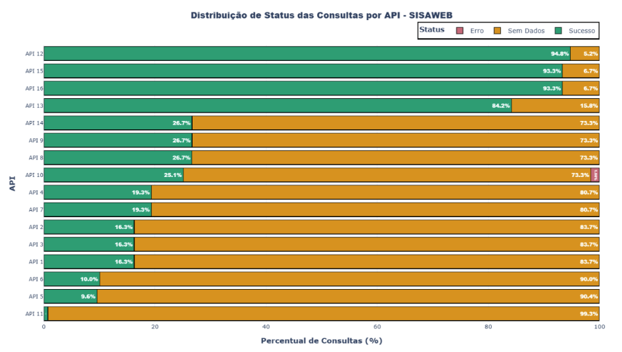 A análise individual das 16 APIs do SISAWEB revela variações significativas na disponibilidade  de dados. As APIs 8 e 9 apresentam as maiores taxas de sucesso (26,66% e 26,69%,  respectivamente), seguidas pelas APIs 4 e 7 (ambas com 19,33%). Em contraste, a API 11  apresenta a menor taxa de sucesso (0,73%), com 99,27% de consultas sem dados, indicando  baixíssima utilização ou cobertura. As APIs 1, 2 e 3 apresentam taxas idênticas (16,27% de  sucesso), sugerindo possível correlação entre esses sistemas. A taxa média de sucesso entre todas  as APIs é de 36,16%, consistente com o panorama geral.