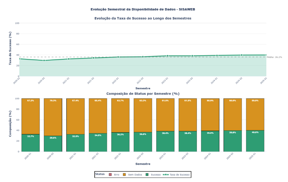 A análise temporal semestral revela tendência de melhora gradual na disponibilidade de dados ao  longo do período estudado. A taxa de sucesso evoluiu de 32,74% no primeiro semestre de 2020  (2020-S1) para 39,38% no primeiro semestre de 2025 (2025-S1), representando aumento de 6,64  pontos percentuais (20,3% de melhora relativa). O melhor desempenho foi observado em 2024- S1, com taxa de sucesso de 40,49%, enquanto o pior desempenho ocorreu em 2020-S2, com  apenas 29,65% de sucesso.