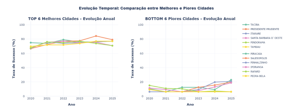 FIGURA 8: Evolução Temporal TOP 6 vs BOTTOM 6 – 2 painéis lado a lado mostrando evolução anual da taxa de  sucesso dos 6 melhores municípios (esquerda) e 6 piores municípios (direita)