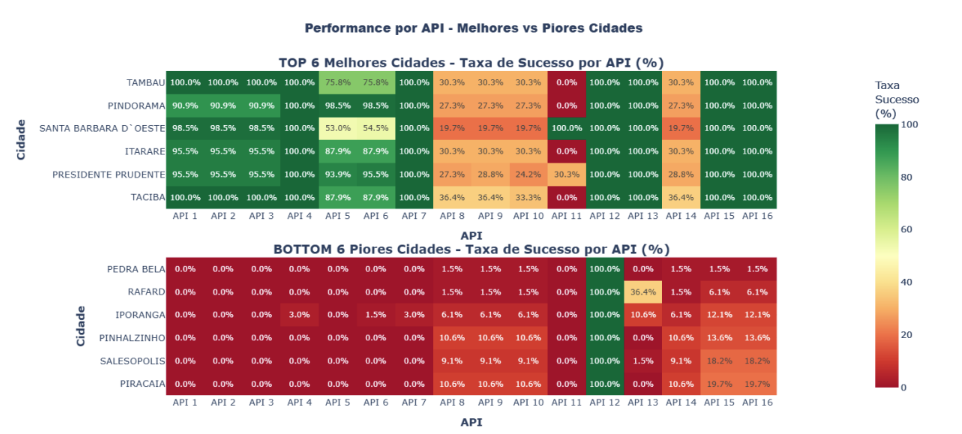 FIGURA 9: Heatmap de Performance por API – 2 heatmaps empilhados verticalmente mostrando taxa de sucesso  por API para TOP 6 (acima) e BOTTOM 6 (abaixo), com escala de cores verde (alta) a vermelho (baixa)
