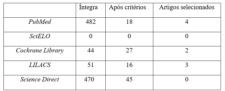 Os trabalhos que preencheram todos os critérios de seleção foram incluídos no estudo, os que não preencheram os critérios e/ou não se mostraram relevantes foram excluídos. Os resultados por análise foram representados na Tabela 1 e estabeleceu-se a construção da Tabela 2 aos estudos selecionados, com formulação das colunas (Autor/Ano; Objetivo; Resultados e Conclusão).