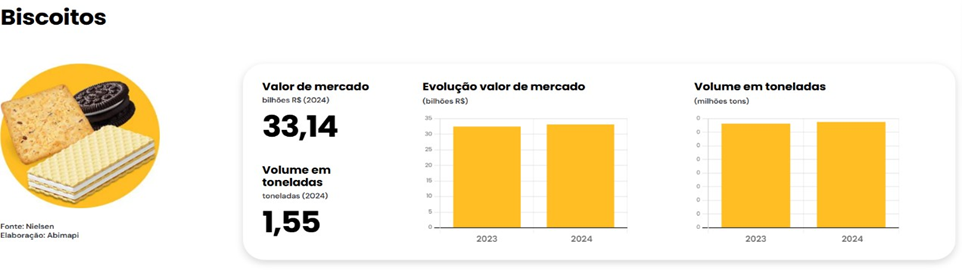 O biscoito é um alimento muito consolidado quando se trata de predileções alimentares. Quando o consumo do alimento ultrapassa 70% de sua inserção nos lares, seu consumo é considerado estável, bem consolidado aos hábitos alimentares e não sofre declínio, o biscoito se enquadra nesta categoria. O mercado de biscoitos no Brasil em 2024, produziu mais de 1,55 bilhões de toneladas está movimentou mais de 33 bilhões de reais no período (ABIMAPI, 2025).