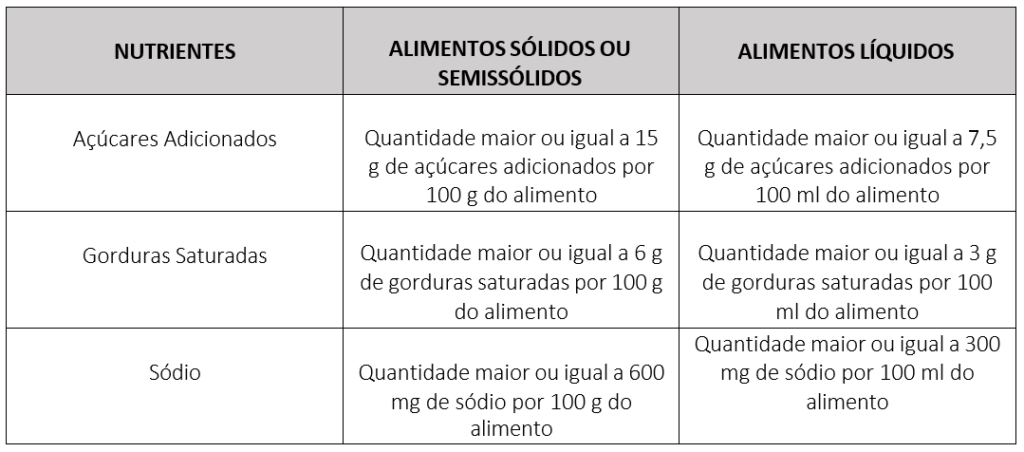 Quadro 1 – Limite crítico dos nutrientes para rotulagem nutricional frontal