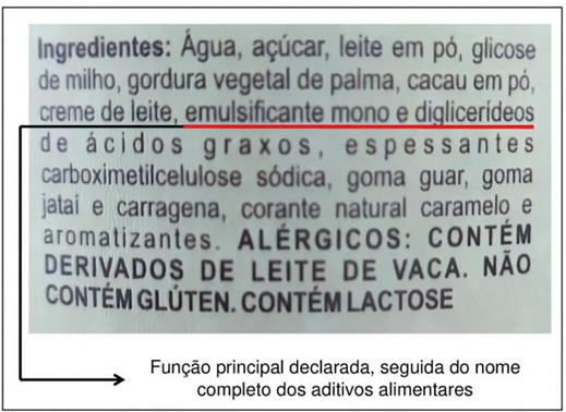 Apesar de os aditivos receberem a classificação básica mencionada, é evidente que eles também são classificados pelas suas funções desempenhadas nos alimentos, alterando algumas de suas características. Na rotulagem, os aditivos devem ser declarados depois dos ingredientes; a função principal deve ser declarada, seguida do nome completo do aditivo (Figura 3) ou do seu número INS (Figura 4) (Brasil, 1988).