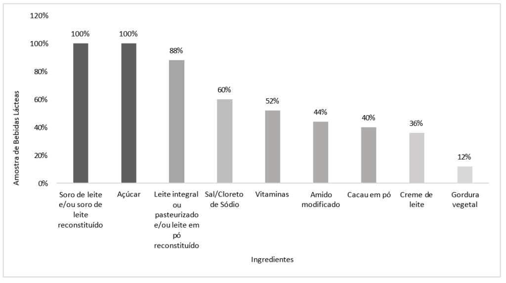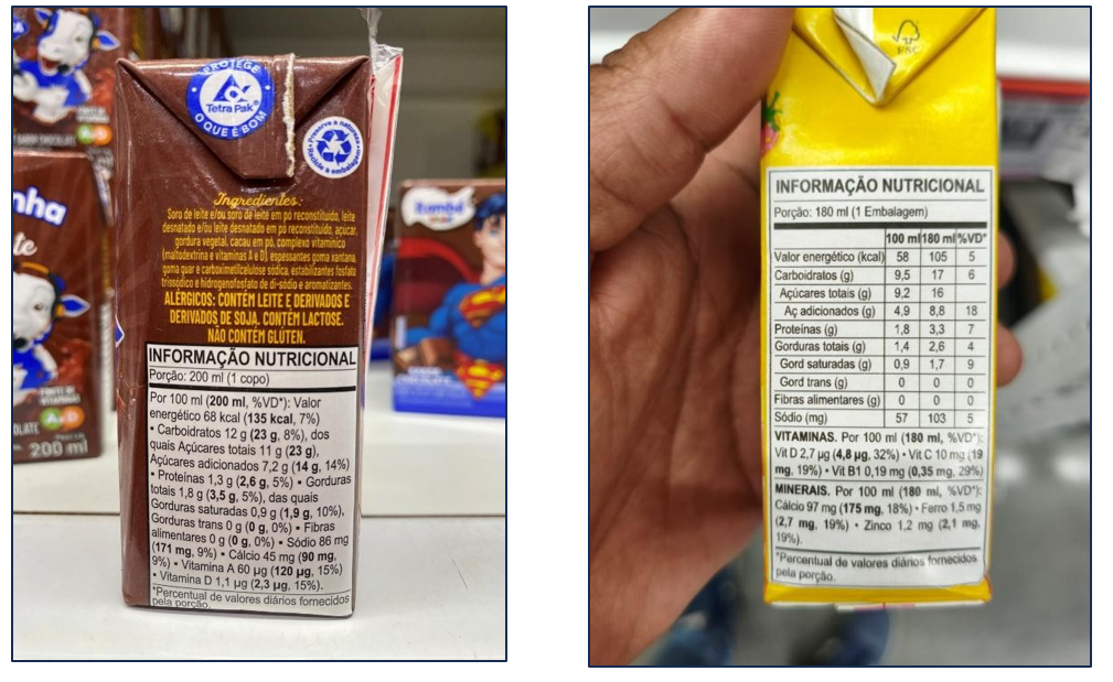As bebidas lácteas, frequentemente confundidas com iogurtes pelas embalagens coloridas e personagens infantis, apresentam em sua composição elevados teores de açúcar, soro de leite em substituição ao leite integral, além de espessantes, corantes e aromatizantes artificiais que mascaram a baixa qualidade nutricional do produto. Essas bebidas são comercializadas como opções saudáveis para o lanche das crianças, mas, na prática, oferecem pouco cálcio e proteínas quando comparados ao leite ou iogurte natural, contribuindo para o consumo excessivo de açúcares simples e aditivos químicos.