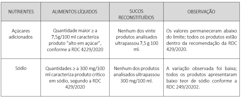 MORAIS, F. C.; LIMA, A. P.; REZENDE, L. M. Composição de sucos industrializados e implicações para a saúde infantil. Revista Brasileira de Pediatria, v.99, n.3, p.112–120, 2021.