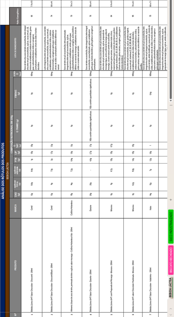 - Identificar os ingredientes presentes nos alimentos industrializados mais consumidos por crianças em idade escolar, incluindo bebidas lácteas, biscoitos recheados e sucos industrializados.