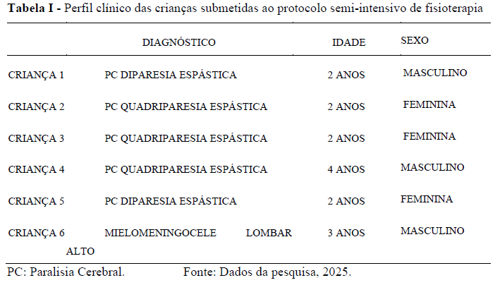 A Tabela I demonstra a diversidade clínica da amostra, composta majoritariamente por crianças com Paralisia Cerebral (PC), sendo três com quadriparesia espástica e duas com diparesia espástica. Apenas uma criança foi diagnosticada com mielomeningocele lombar alta. Essa variedade permite observar a aplicação do protocolo em diferentes perfis neurológicos.