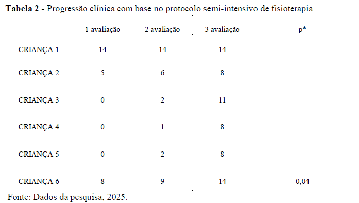 Assim, ao comparar os resultados individuais e coletivos das tabelas com os estudos de referência, evidencia-se uma forte convergência metodológica e clínica, situando o presente trabalho como contribuição relevante ao campo da fisioterapia pediátrica, em especial no que se refere à aplicabilidade e eficácia de protocolos semi-intensivos.