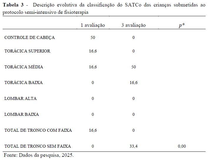 A Tabela II apresenta os escores obtidos no Segmental Assessment of Trunk Control (SATCo), instrumento utilizado para avaliar o controle postural segmentar das crianças antes, durante e após o protocolo semi-intensivo de fisioterapia. O SATCo analisa o alinhamento e a estabilidade do tronco em diferentes segmentos corporais, atribuindo escores de 0 a 20 pontos, nos quais valores mais baixos indicam maior dependência de suporte e valores mais altos representam melhor controle postural e independência funcional.