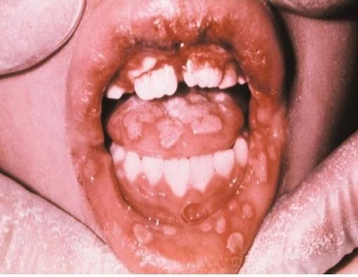 Após a infecção primária o vírus percorre os nervos sensitivos até os gânglios, podendo ficar em estado de latência no organismo. Onde pode ser reativado por contaminação via secreções salivares ou condições de vulnerabilidade como estresse, idade avançada, doenças sistêmicas, gravidez, mudanças de temperaturas e alterações hormonais (Neville et al., 2009). A manifestação sintomática mais comum na infecção primária é a gengivoestomatite herpética primária aguda, representando 90% dos casos. Ocorre entre 6 meses e 5 anos, com prevalência entre 2-3 anos. Casos abaixo de 6 meses são raros devido aos anticorpos maternos. O desenvolvimento inicial são lesões vesiculares que formam feridas múltiplas pequenas e avermelhadas, como na Figura 1. Localiza-se na mucosa e afeta a gengiva, que fica sensível e inchada, como na Figura 2. Os casos se resolvem em 5-7 dias (Neville et al., 2009).