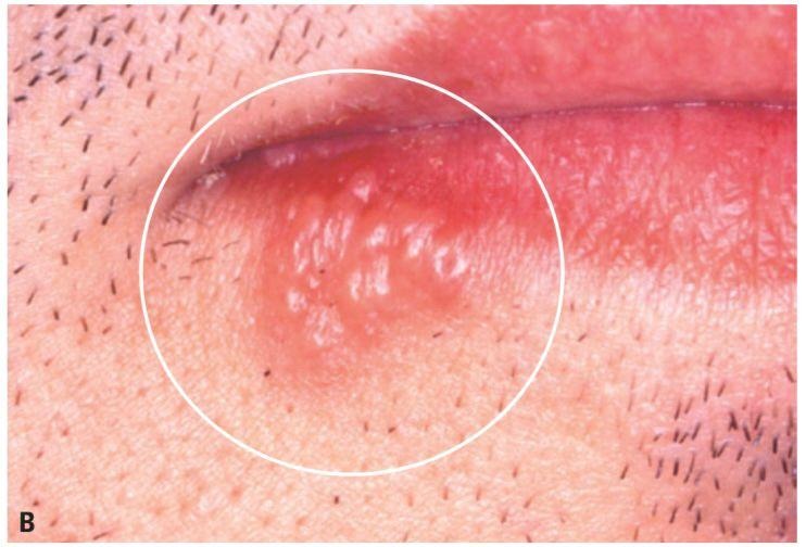 Em critérios de avaliação o HSV-1 recorrente possui um determinado padrão de manifestações dos quais são presentemente acompanhados de vesículas, que evoluem e se rompem tornando-se úlceras que comprometem tarefas simples como a fala e deglutição de alimentos por promoverem dor e desconforto ao paciente (Vazzoller et al., 2016; Bressan et al., 2021). Essas características precedem sintomas como coceira, formigamento, ardência na região, dor em um período entre 6 e 24 horas antes dos sinais clínicos (Balasubramaniam; Kuperstein; Stoopler, 2014).