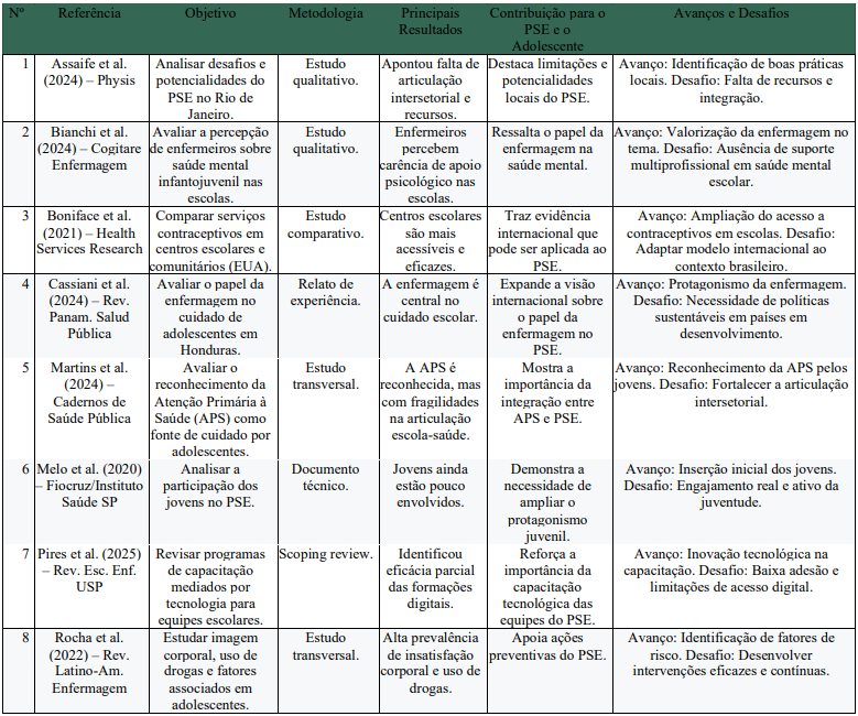 4. Tabela – Síntese dos Artigos da Revisão Integrativa sobre o PSE e a Saúde do Adolescente