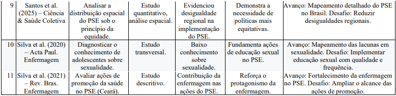 A análise dos estudos selecionados nesta revisão integrativa corrobora a relevância do Programa Saúde na Escola (PSE) como uma estratégia de promoção da saúde, mas também evidencia os desafios que comprometem a sua equidade e eficácia. Os achados, compilados a partir de diferentes fontes, revelam avanços e fragilidades que demandam atenção crítica para a consolidação do programa.
