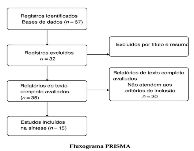 Após a aplicação dos critérios de busca, foram inicialmente identificados 67 estudos. Na triagem por título e resumo, 32 foram excluídos por não atenderem aos objetivos propostos. Dos 35 textos avaliados na íntegra, 20 foram eliminados por não se enquadrarem nos critérios de inclusão, restando 15 artigos para análise final. Esses artigos compuseram a amostra definitiva do estudo, que foi organizada em tabela síntese e discutida em clusters temáticos correspondentes às dimensões centrais da assistência de enfermagem.