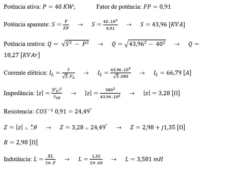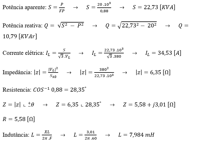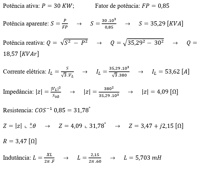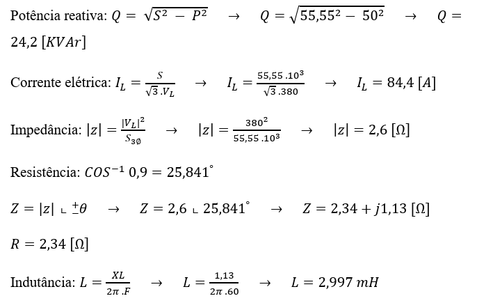 Foram calculadas as potências aparente e reativa, a corrente elétrica, a impedância, a resistência e indutância de cada carga.