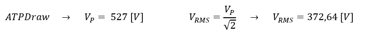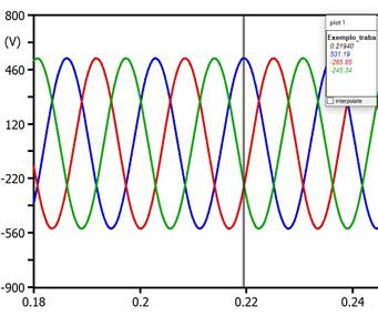 A tensão elétrica do secundário é de 380 V, ao simular esse valor no software sem a correção do fator de potência a tensão elétrica demostra um valor um pouco mais baixo, conforme figura 3.