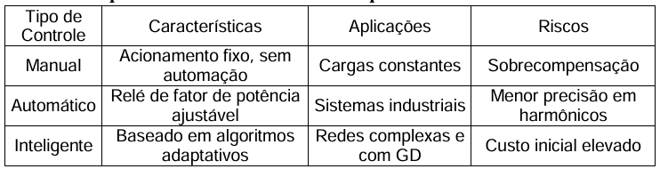 O controle adequado dos bancos de capacitores é determinante para garantir o equilíbrio entre eficiência energética e segurança operacional. Esse controle pode ser classificado como manual, automático ou inteligente, dependendo do nível de sofisticação tecnológica adotado, conforme tabela 1.