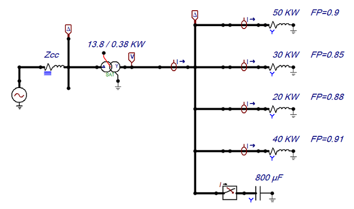 Foi adotado valores fictícios para quatro cargas trifásicas baseado em um processo industrial de um Centro de Comando de Motores (CCM), conforme figura 1. Através da potência ativa e do fator de potência de cada carga foi realizado manualmente os cálculos para obtenção das grandezas necessárias para o dimensionamento do banco de capacitor.