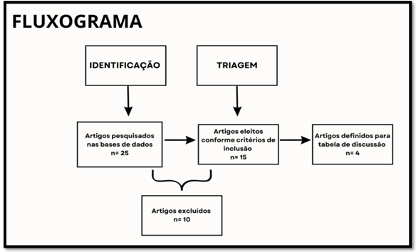 A metodologia envolve pesquisas baseadas em outros artigos acadêmicos que já abordaram o assunto, com experiências ligadas diretamente ao tema pesquisado. Os critérios de exclusão foram: adultos autistas, crianças com grau severo de autismo, crianças não diagnosticadas por um profissional, outros diagnósticos associados ligados à saúde mental e para a base técnica, artigos anteriores a 2017 e publicações sem caráter científico. Os critérios de inclusão: crianças do sexo masculino e feminino, já diagnosticados, crianças com autismo leve, indicação de profissionais para este tipo de terapia, fisioterapia neurofuncional e esportiva como subespecialidades da fisioterapia, a especialidade principal, artigos que datam de 2017 até 2025 nos idiomas: português, espanhol e inglês. A Figura (1) apresenta o fluxograma dos artigos escolhidos.