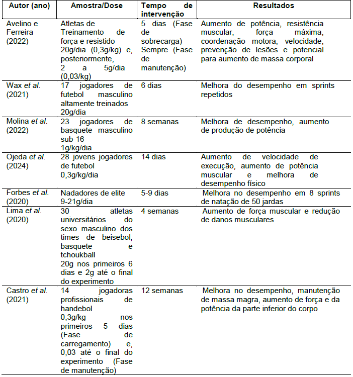 A tabela 1 reúne os principais estudos selecionados para esta pesquisa, nos quais atletas de diferentes modalidades foram submetidos a distintas estratégias de suplementação, com o objetivo de aprimorar o desempenho físico. Entre os aspectos analisados destacam-se o aumento de potência, velocidade e outras variáveis que, em conjunto, contribuem para a melhoria da performance esportiva e, consequentemente, para a obtenção de melhores resultados nas práticas competitivas.