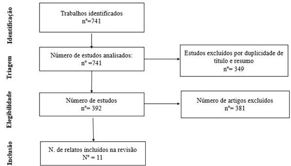 A seleção iniciou com a identificação de 741 trabalhos. Após a análise, 349 foram excluídos por duplicidade de título e resumo, permanecendo 392 estudos. Dos, 381 foram retirados por não atenderem aos critérios de elegibilidade. Assim, 11 relatos compuseram a amostra incluída na revisão.