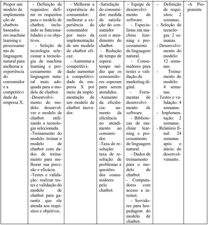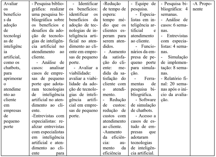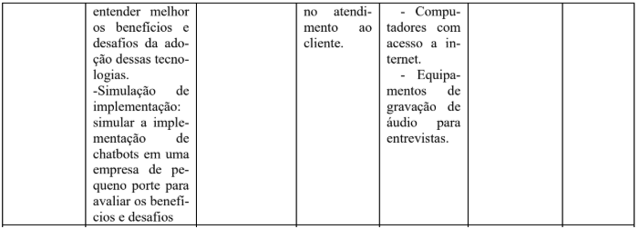 A contribuição esperada também inclui o desenvolvimento de um modelo de implementação de chatbots que possa ser replicado em outras empresas de pequeno porte, promovendo a melhoria da prática de atendimento ao cliente e a adoção de tecnologias inovadoras. Em resumo, espera-se que os resultados alcançados possam ter um impacto positivo significativo na empresa X e no setor como um todo, melhorando a experiência do consumidor e a competitividade das empresas.
