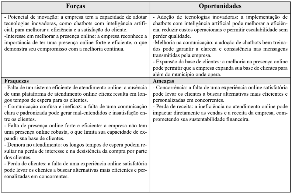 Ao analisar a matriz SWOT da empresa X, é possível identificar oportunidades significativas para melhorar sua presença online e aumentar a satisfação do cliente por meio da adoção de tecnologias inovadoras, como chatbots com inteligência artificial. A matriz SWOT revela que a empresa tem potencial de inovação e interesse em melhorar sua presença online, o que pode ser aproveitado para implementar soluções de atendimento ao cliente mais eficientes e personalizadas.