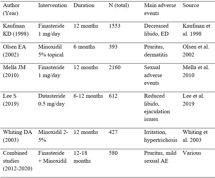 Os resultados demonstram que finasterida, dutasterida e minoxidil possuem perfis de segurança distintos, mas globalmente favoráveis. Os efeitos adversos sexuais associados à finasterida e dutasterida apresentam baixa gravidade e são habitualmente reversíveis. Minoxidil demonstrou maior incidência de eventos dermatológicos, sobretudo hipertricose e irritação. Apesar dos aumentos relativos observados, a taxa absoluta de descontinuação permanece baixa. A robustez dos resultados é apoiada por análises de sensibilidade e ausência de viés de publicação significativo.