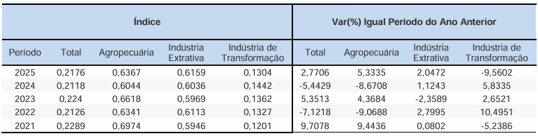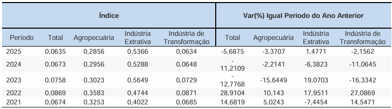 No setor da Agropecuária, os índices revelam um nível significativamente mais elevado de concentração, com valores consistentes acima de 0,60 em todo o período. O maior valor foi observado em 2021 (0,6974), seguido de uma leve redução em 2022 (0,6341) e novo aumento em 2023 (0,6618). A partir de então, o índice apresenta trajetória de queda, atingindo 0,6367 em 2025. Apesar da redução no final da série, os resultados reforçam uma forte dependência de poucos produtos agropecuários, o que pode indicar vulnerabilidade a choques de mercado associados à oscilação de preços ou demanda de itens específicos.