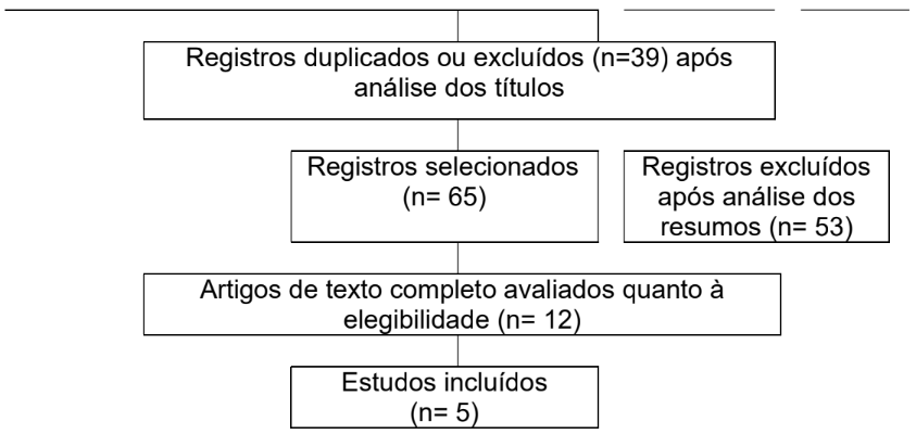 O processo de busca e seleção dos artigos, como visto anteriormente, seguiu um fluxograma sistemático: inicialmente, foram identificados 32 registros na SciELO, 55 no PubMed e 28 no Portal CAPES, totalizando 115 artigos. Após a remoção de 39 registros duplicados ou excluídos pela análise dos títulos, 65 artigos foram selecionados para análise dos resumos, dos quais 53 foram excluídos por não atenderem aos critérios. Dos 12 artigos restantes avaliados na íntegra, apenas 5 foram incluídos na revisão final, conforme os critérios de elegibilidade pré-estabelecidos.