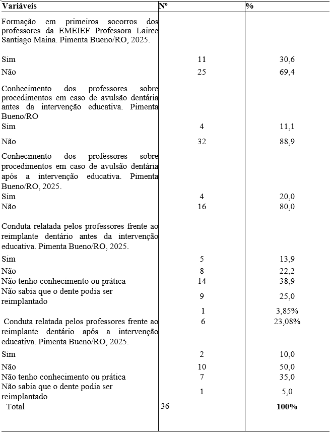 De modo geral, os resultados evidenciam melhora no conhecimento dos profissionais após a intervenção educativa, reforçando a importância de ações de educação em saúde voltadas ao manejo do trauma dentário no ambiente escolar.