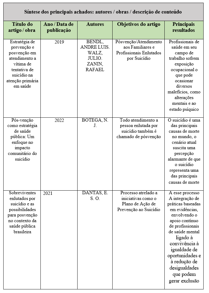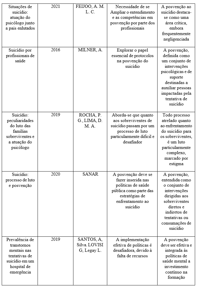 Conclui-se que a pesquisa tendo como foco adquirir conhecimentos acerca do assunto, buscando assim a explicação e determinado ao tema, onde, o luto por suicídio e o entendimento de profissionais de saúde diz respeito direto perante ao processo de posvenção, sendo que para os profissionais de saúde, este processo atua como meio de conscientização, orientação e compartilhamento da relevância do tema que se faz atribuído, logo, nessas situações, é crucial agir com calma, empatia e seguir os protocolos estabelecidos para lidar com emergências.