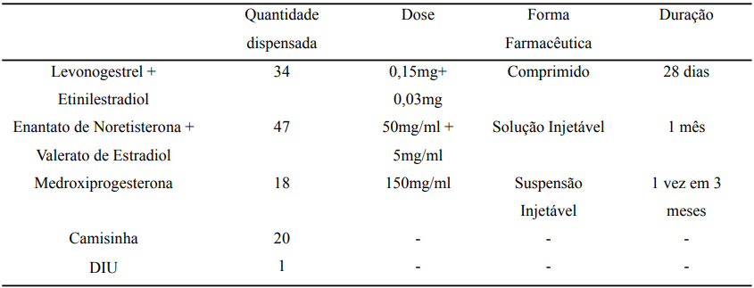 De acordo com os resultados encontrados, observa-se a alta demanda de prescrições com noretisterona + valerato de estradiol. Pode-se observar que ele está sendo usado como método de primeira escolha. Além disso, muitas mulheres optam por este método por ser mais prático, pela comodidade e ter menor risco de esquecimento quando comparado aos contraceptivos orais.