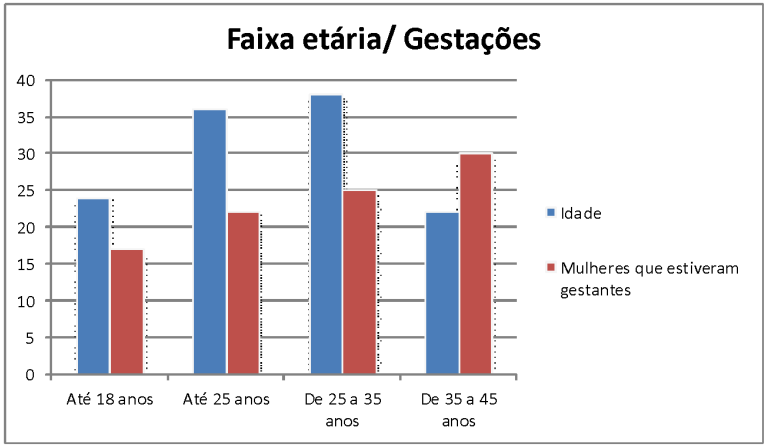 De acordo com a tabela, 30 mulheres com faixa etária entre 35-45 anos relataram já ter tido entre 1-8 gestações. O Instituto Brasileiro de Geografia e Estatística (IBGE) (2002) revela que o número de mães com mais de 40 anos no Brasil cresceu 27%, entre 1991 e 2000. Aquelas que tiveram filho pela primeira vez com idade entre 40 e 49 anos fazem parte de um segmento populacional com alta escolaridade. E ainda reforçam que uma das razões para que muitas mulheres adiem o sonho da maternidade é a carreira profissional. A formação escolar de uma pessoa com grau universitário exige pelo menos quinze anos de estudo. Isso significa que dificilmente uma mulher está formada antes dos 22 anos.
