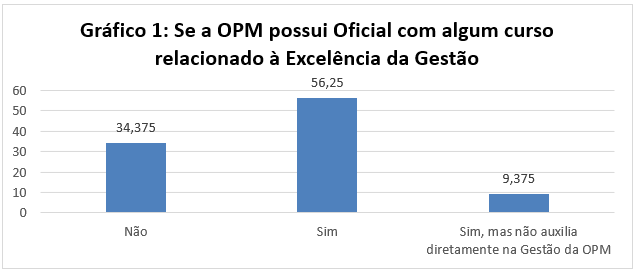 Por fim, foi ainda questionado “Quais resultados você espera alcançar com uma consultoria em excelência da gestão?”, tendo 81,25% dos pesquisados afirmado que esperam ser “Aumento da Produtividade” o que mostra a importância do MEG para a estratégia da Corporação em buscar aumentar entregas ao público. Ainda neste questionamento foi obtido que 78,12% dos entrevistados esperam que ocorra uma “Maior organização da Gestão da OPM”, validando assim o modelo. A terceira maior expectativa na OPM ser certificada no Prêmio de Qualidade, com 56,25% dos pesquisados tendo assinalado tal afirmativa.