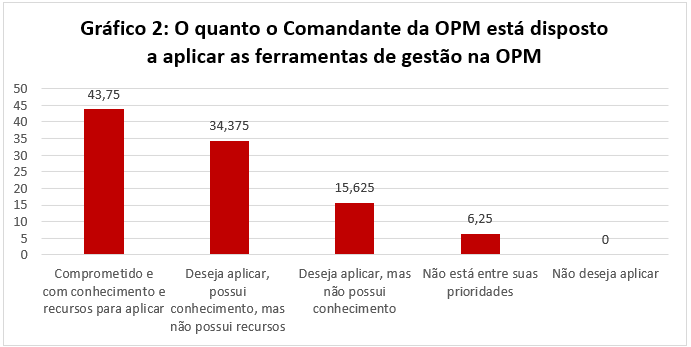 No Gráfico 2, representa o resultado do questionamento sobre “O quanto o Comandante da OPM está disposto a aplicar as ferramentas de gestão na OPM”, objetivando sentir o nível de motivação dos pesquisados para com o Modelo.