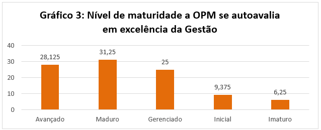 O Gráfico 3, nos traz os resultados referentes à verificação do nível de maturidade que os pesquisados consideram ter atingidos, tendo sido obtido que 28,12% dos pesquisados afirmaram já ter atingido o nível avançado no MEG.O maior percentual encontra-se no nível Maduro, ou seja, 30,25 % dos pesquisados. Isso nos garante que a maioria está no nível avançado ou maduro, representando 59,37% do total dos pesquisados. Apenas 6,25% afirmaram ainda estarem no nível Imaturo.
