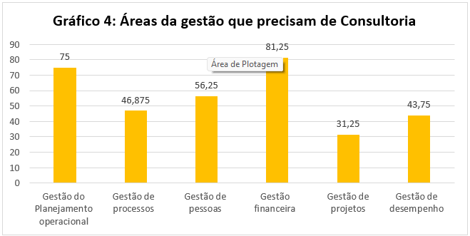 Percebe-se na leitura do Gráfico 4, que a área de Gestão Financeira se destacou entre as demandas dos pesquisados com 81,25% deles afirmando tal carência. Logo depois vem a área de Gestão do Planejamento Operacional com 75% dos pesquisados afirmando que precisam de consultoria interna. Em terceiro lugar vem a área de Gestão de Pessoas com 56,25% dos pesquisados informando que precisam dos serviços de consultoria do MEG para as questões que envolvem a gestão de pessoal.
