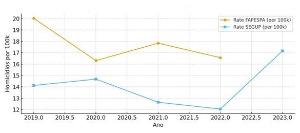 A comparação entre diferentes bases de dados, como FAPESPA e SEGUP, também ressaltou divergências metodológicas significativas, evidenciando a importância de consolidar registros padronizados de CVLI para subsidiar ações de monitoramento e planejamento estratégico. Diferenças nos critérios de classificação de homicídios dolosos, latrocínios e lesões corporais seguidas de morte explicam parte da oscilação entre as séries analisadas.