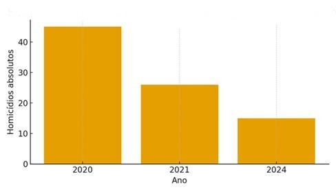 Esses dados sugerem uma trajetória de queda contínua entre 2017 e 2020, seguida de leve oscilação em 2021. Porém, quando se observa a base específica da SEGUP, os números diferem um pouco: 14,12 (2019), 14,68 (2020), 12,65 (2021), 12,05 (2022) e aumento para 17,17 (2023). A divergência reforça a importância de considerar diferentes metodologias e definições adotadas por cada órgão. Além disso, os registros parciais de 2024 — 15 homicídios entre janeiro e maio — apontam para possível queda em comparação ao ano anterior, mas não permitem conclusões devido à incompletude da série.