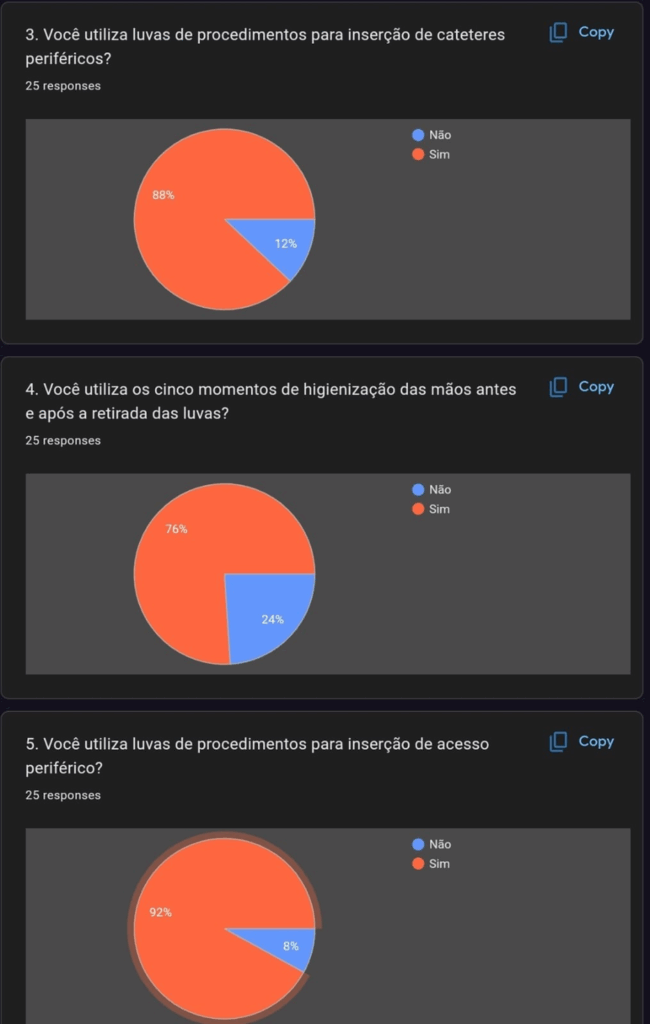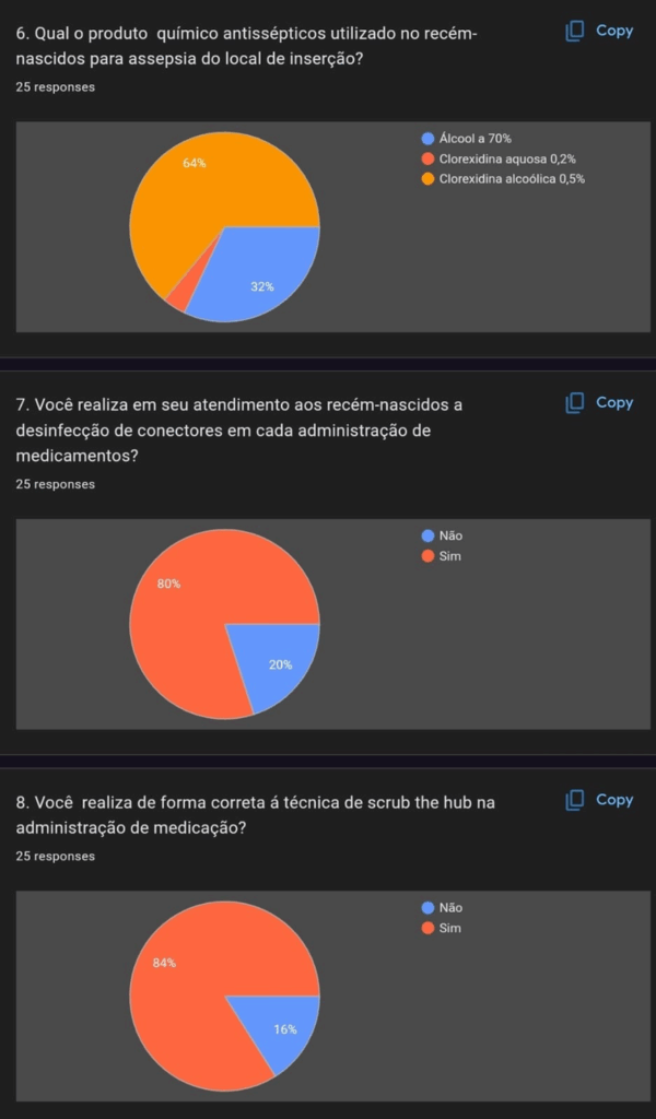 Esses resultados, embora limitados ao grupo participante, reforçam a necessidade de padronização de protocolos e educação permanente da equipe, pois falhas pontuais nas práticas de controle de infecção, como a não utilização de luvas ou a desinfecção inadequada de conectores, aumentam significativamente o risco de infecções da corrente sanguínea em ambientes críticos como a UTI Neonatal.